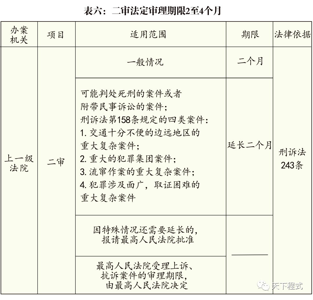 《刑訴法》第243條:第二審人民法院受理上訴、抗訴案件,應(yīng)當(dāng)在二個(gè)月以內(nèi)審結(jié)。對(duì)于可能判處死刑的案件或者附帶民事訴訟的案件,以及有本法第一百五十八條規(guī)定情形之一的,經(jīng)省、自治區(qū)、直轄市高級(jí)人民法院批準(zhǔn)或者決定,可以延長(zhǎng)二個(gè)月;因特殊情況還需要延長(zhǎng)的,報(bào)請(qǐng)最高人民法院批準(zhǔn)。最高人民法院受理上訴、抗訴案件的審理期限,由最高人民法院決定。