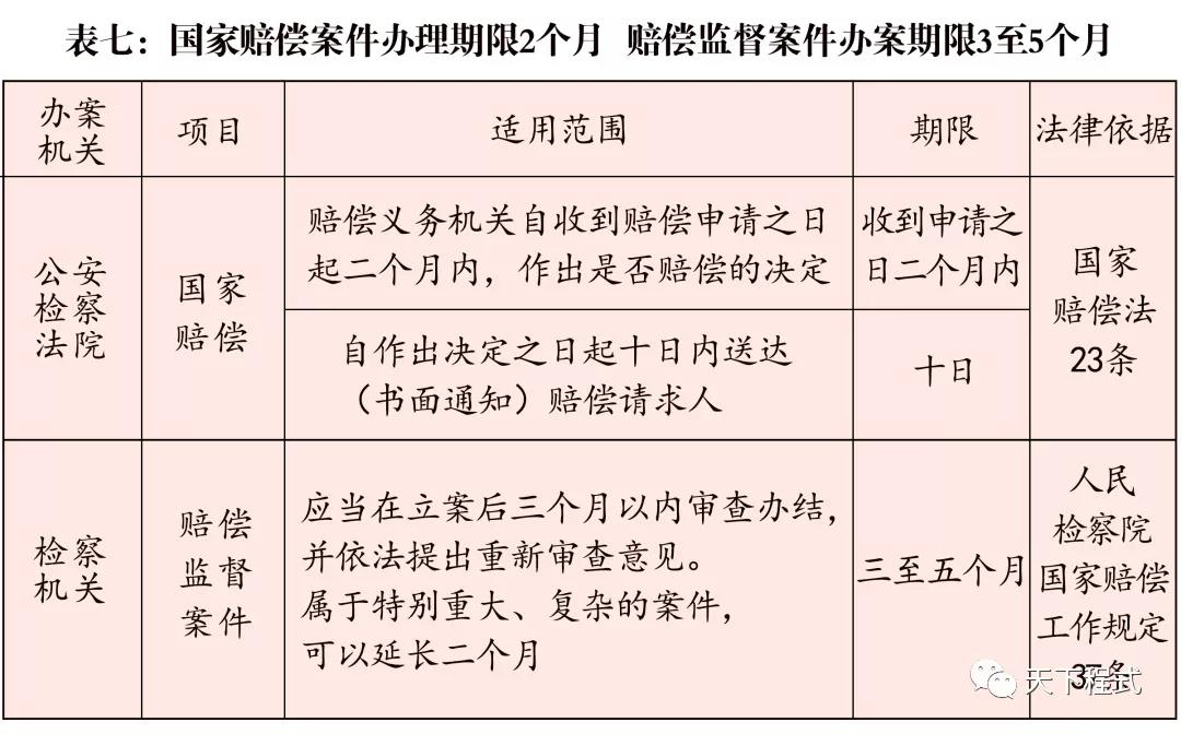 以下內(nèi)容根據(jù)《中華人民共和國(guó)刑事訴訟法》(下稱刑訴法)《人民檢察院刑事訴訟規(guī)則》(下表稱規(guī)則)《中華人民共和國(guó)國(guó)家賠償法》《人民檢察院國(guó)家賠償工作規(guī)定》《最高人民法院關(guān)于嚴(yán)格執(zhí)行案件審理期限制度的若干規(guī)定》整理。